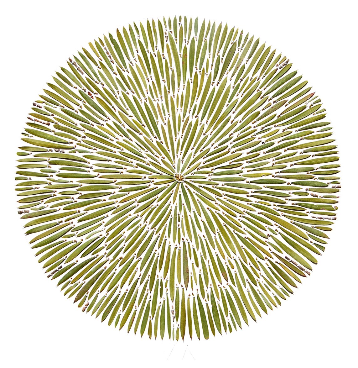 Scarlet Bottlebrush (Callistemon rugulosus var rugulosus) leaves, linen thread and bookbinder’s gum on canvas