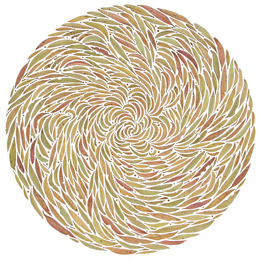 Purple-flowered Mallee-box (Eucalyptus lansdowneana ssp. albopurpurea) leaves and flower caps, linen thread and bookbinder’s gum on canvas