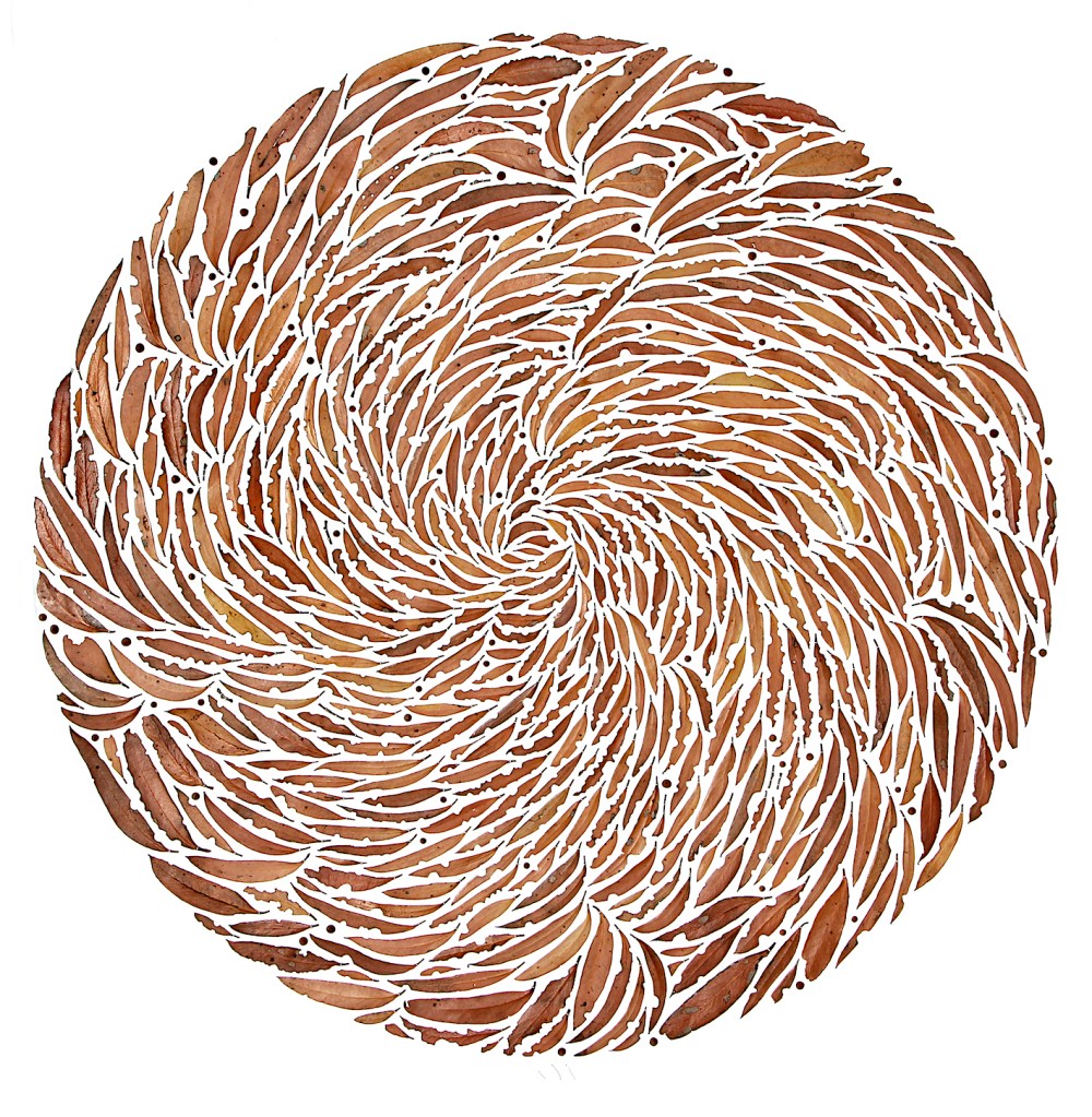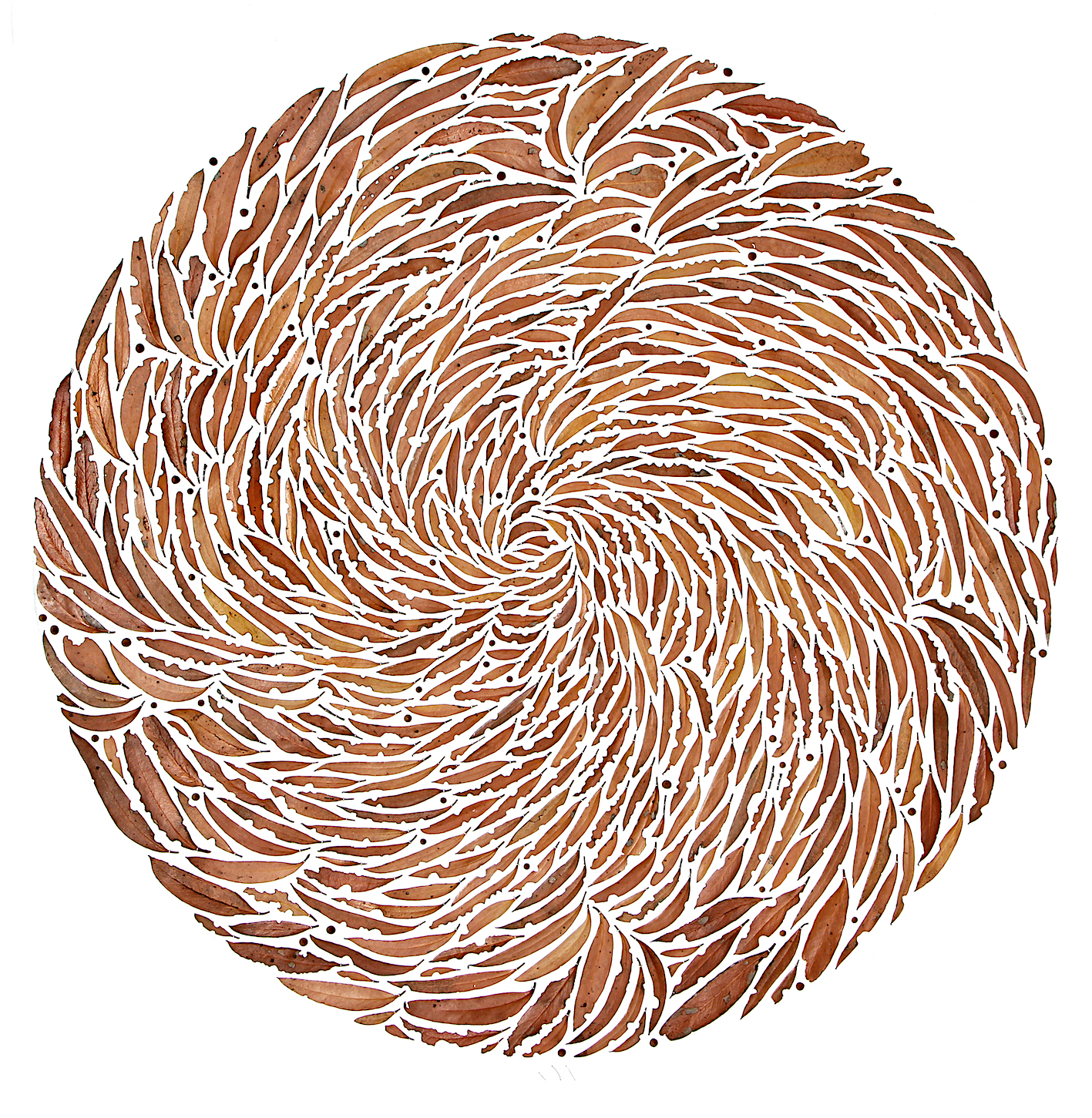 Coastal White Mallee (Eucalyptus diversifolia) leaves, chewed by scarab beetles, and flower caps from a drought-stricken tree, linen thread and bookbinder’s gum on canvas